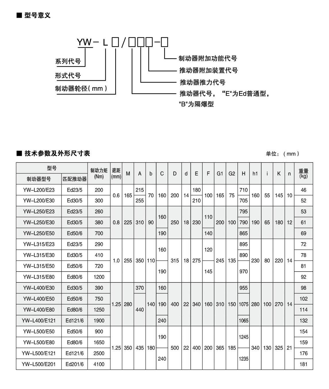 YW-L系列制动器安装尺寸及制动力矩参数符合JB/T6406-2006标准和DIN15435标准。配套符合DIN15430标准的Ed系列推动器。